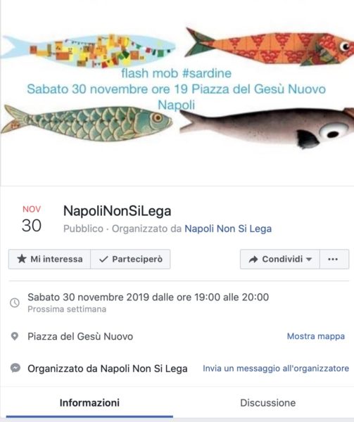 LE SARDINE – Il movimento anti-Salvini si sta diffondendo a macchia d’olio da Nord a Sud e non lascia indifferenti i cittadini della Campania. Nato come una sorta di contro manifestazione, a Bologna ha fatto scendere in piazza oltre 15 mila persone. L’evento era stato lanciato via social e ideato da un laureato di Scienze Politiche insieme a tre suoi ex coinquilini per dire no alla Lega. “Staremo stretti come le sardine, perché saremo in tanti”. Una protesta senza bandiere politiche e pacifica, che vede come simbolo scelto un pesce che però si unisce al branco. E così è stato, perché l’unione fa la forza e Salvini rischia di finire ‘ in scatola’.