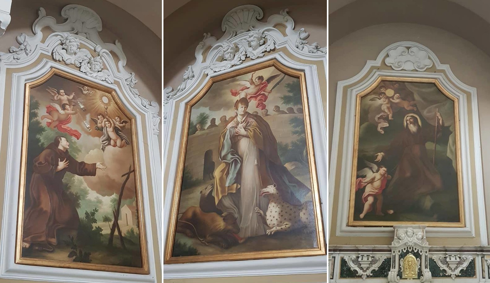 Citiamo i protagonisti delle tele: San Gennaro, San Francesco di Paola, San Pasquale e Sant’Antonio. Siccome i fedeli erano strettamente legati alle opere pittoriche, il santuario fu dotato di riproduzioni (presenti nell’immagine di copertina). Arriva di recente la bella notizia: parti di tela sono state ritrovate, in particolare dei putti presenti nelle due tele raffiguranti rispettivamente san Francesco di Paola e Pasquale. Questi sono stati localizzati nel territorio della Calabria, con più precisione in un negozio di antiquariato di Crotone.