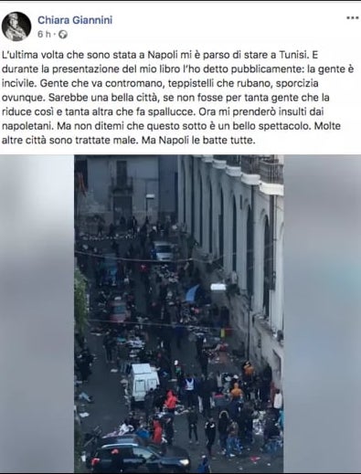 Chiara Giannini ha concluso il suo post affermando: “Molte altre città sono trattate male. Ma Napoli le batte tutte“. Poco dopo, la giornalista ha rimosso il post dal suo profilo, e in un altro post ha risposto a un insulto ricevuto. Sembra che una donna che abbia invitato Chiara Giannini a “trovarsi un uomo” invece di pubblicare commenti pieni di odio, e l’ha accusata di “fare le foto col seno in mostra”.