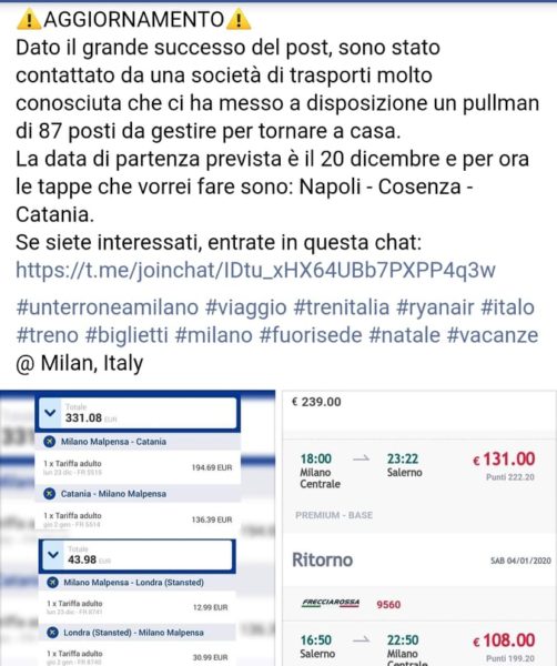 “Cara Trenitalia, cara Ryanair, cara Politica italiana, qui è un semplice terrone a Milano che vi scrive, ma lo fa con il cuore in mano e a nome di tutti quelli come lui. Non siamo stupidi, siamo ben consapevoli che l’economia si fondi sulla legge della domanda e dell’offerta e che siamo davvero in tantissimi a voler tornare a casa per le feste”.