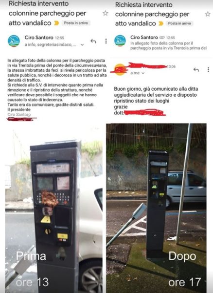 Il parchimetro, come posta sui social Ciro Santoro, Presidente dell’Associazione di Promozione Sociale (Aps) Nuovo Progetto Ercolano, è stato ripulito nel pomeriggio di ieri: “IL MIO GRAZIE e plauso alla Polizia Locale nella persona del Com.te Zenti e alla Pubbliparking che ha accolto la mia mail e segnalazione UFFICIALE, dando immediatamente una risposta efficiente e risolutiva al problema. Ora resta a noi continuare a rispettare e far rispettare la nostra città”. Queste le parole che accompagnato le foto.