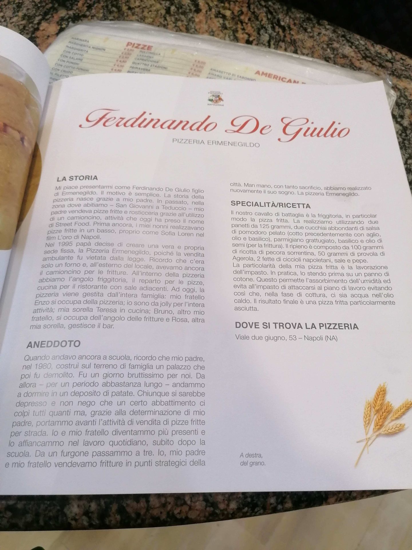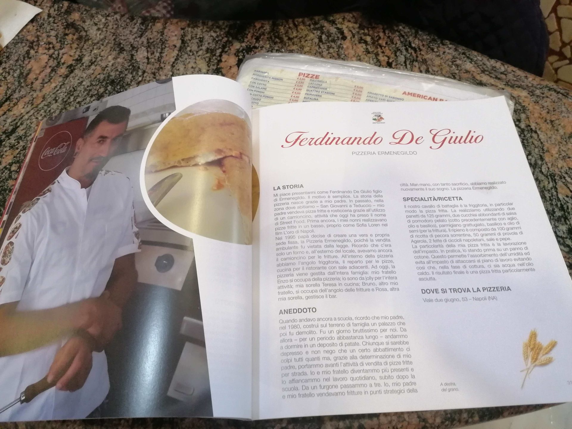 La Pizzeria Ermenegildo si trova tra Barra e San Giovanni, in un punto nevralgico, e da anni soddisfa le richieste dei suoi clienti. Vesuviolive.it ha avuto il piacere di intervistare Ferdinando De Giulio, uno dei migliori pizzaioli di Napoli, in occasione dell’uscita del libro dell’Associazione Pizzaioli Napoletani, sui 40 migliori pizzaioli di Napoli, di cui fa parte.