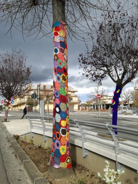 Ad Apice questo fenomeno c’è già da due anni, da quando un gruppo di signore, di diverse età si sono date appuntamento settimanale nella biblioteca, su invito della Proloco e hanno iniziato a produrre strisce, mattonelle e centrini dai colori vivaci con cui hanno creato delle coperture intorno agli alberi. Un movimento spontaneo che nasce dal piacere di fare, colorare e prendersi cura del paese.