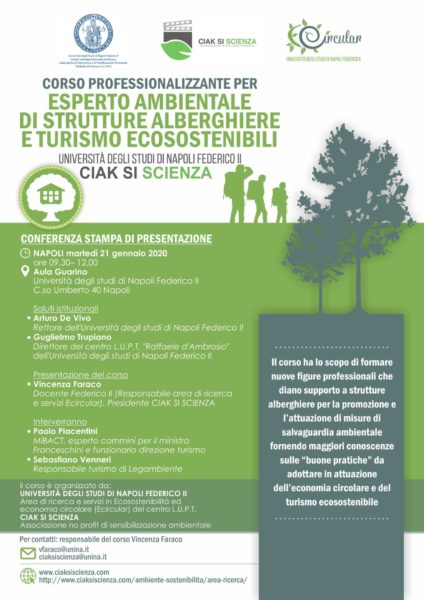 Il corso professionalizzante per esperto ambientale di strutture alberghiere e turismo ecosostenibili ha lo scopo di formare e promuovere nuove figure professionali per supportare le strutture alberghiere nell’attuazione di misure di salvaguardia ambientale. Organizzato dall’Area di ricerca e servizi in Ecosostenibilità ed economia circolare (Ecircular) dell’Università degli Studi di Napoli Federico II (centro L.U.P.T. “Raffaele D’ambrosio”) e Ciak si Scienza, associazione no profit di sensibilizzazione ambientale, il corso verrà presentato durante una conferenza stampa che si terrà martedì 21 gennaio 2020 alle ore 9:30 presso l’aula Guarino dell’Università degli Studi di Napoli Federico II, con sede in Corso Umberto I 40, Napoli.