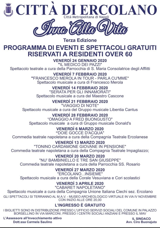 Tutti gli spettacoli inizieranno alle ore 20. Gli interessati possono richiedere i biglietti ai due Centri Anziani presenti in città (Officina della Pace in via Aldo Moro e Radici della Memoria in piazza Pugliano), al Mav e all’Ufficio Servizi Sociali del Comune presso Palazzo Borsellino in via Marconi.