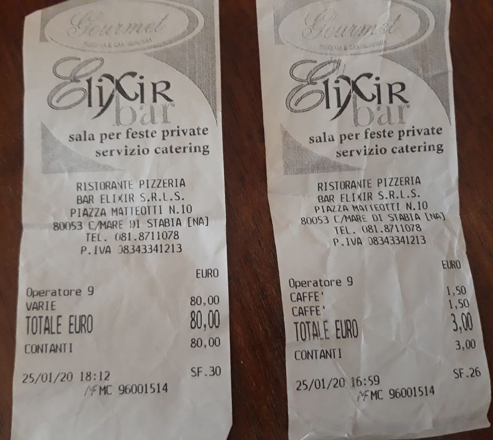 Nel post vi allego il mio scontrino da 80 euro per 9 caffè e quello di 2 avventori che erano seduti con noi che sono andati via per primi e hanno pagato di tasca loro. INTERESSANTE NOTARE CHE IN OLTRE 2 ORE IL LOCALE HA BATTUTO SOLO 4 SCONTRINI. Ringrazio tutti i cittadini e i commercianti di Castellammare di Stabia per il sostegno che mi stanno manifestando e per i tanti nuovi inviti che ho ricevuto. State certi che come in ogni nostra denuncia e battaglia andremo fino in fondo”.