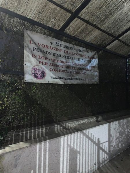 Fuori dalla cappella c’è un cartello con su riportate le scuse per le condizioni precarie di questa dovute alla mancanza di interventi da parte delle istituzioni ed organi competenti, attraverso le parole riportate sul manifesto si legge lo sgomento e la rabbia dei parenti ormai dimenticati. Una strage ormai passata per tutti, ma non per chi vive con il peso della morte addosso e non ha altro modo di ricordare che attraverso le semplici cose, come portare un fiore in quella cappella e ricordare quello che era. Serve fare qualcosa per poter dare un po’ di pace e giustizia a chi solo questo chiede da 24 anni.
