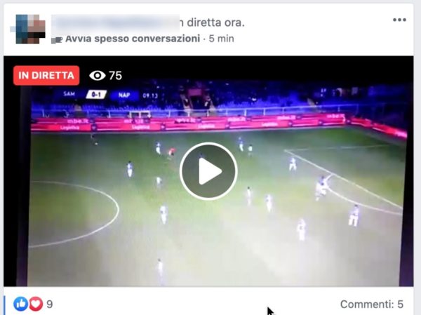 Ed è proprio Ciro uno dei più attivi in questo campo, pubblicando la diretta della partita in diversi gruppi e avendo anche un profilo instagram di cui va fiero e sponsorizza nel commento alle gare. Ma le partite del Napoli vengono trasmesse in diretta anche da altri utenti su Facebook come Gennaro (altro nome di fantasia) che ha il badge di fan più attivo della pagina e avvia spesso conversazioni.