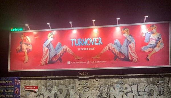 Si tratta di un poster di 6 metri per tre che è stato fatto installare dall’azienda di abbigliamento napoletana “Turnover”. Il cartellone raffigura una modella in quattro diverse pose che oltre a pubblicizzare i capi d’abbigliamento dell’azienda, indossa anche una mascherina, di quelle che si utilizzano per proteggersi da infezioni e agenti inquinanti. A completare il tutto è lo slogan, immancabile per ogni pubblicità che si rispetti, posto al centro del cartellone, dove si legge: “Turnover is the new virus” che tradotto vuol dire: “Turnover è il nuovo virus”.