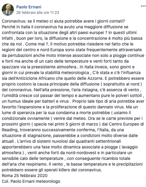 Prosegue: “In Italia c’è stata e c’è l’influenza sia dell’anticiclone africano che quello delle Azzorre. E potrebbero essere proprio loro la causa principale della diffusione, soprattutto al Nord, del coronavirus. Nell’alta pressione l’aria ristagna, c’è assenza di vento, l’umidità cresce col passare del tempo e aumentano pure le polveri sottili, un humus ideale per batteri e virus. L’arrivo di sistemi nuvolosi dai quadranti settentrionali apporterebbe una fase molto dinamica associata a piogge, che comportano un lavaggio dell’atmosfera, venti anche forti da nord-nordovest e in particolare un sensibile calo delle temperature, con conseguente ricambio totale dell’aria che respiriamo. Il vento, le basse temperature e le precipitazioni potrebbero essere gli sperati killer del coronavirus“.