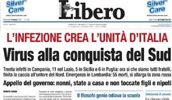 E’ così che il quotidiano “Libero” ci ricasca e pubblica in prima pagina un articolo dal titolo: “Virus alla conquista del Sud- L’infezione crea l’Unità d’Italia”. Un’espressione che sa di esultanza, che equivale a dire finalmente arriva pure nel Mezzogiorno e non siamo solo noi gli “appestati”.