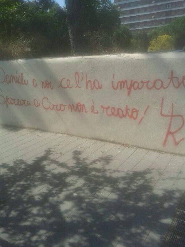 “Siamo in clima dei mondiali di calcio. Tutti tifiamo per il nostro Paese. Ma tutti ci siamo “dimenticati” che c’è un ragazzo che sta combattendo ancora oggi la sua battaglia per la vita. Ciro Esposito, tifoso del Napoli, rimasto gravemente ferito prima della finale di Coppa Italia a Roma tra il Napoli e la Fiorentina. Ciro non sta bene. Io qualche giorno ho fotografato questa scritta sui muri in via Monte Nero che offende Roma. Ancora oggi non e’ stata cancellata. Forza Ciro!!!”.