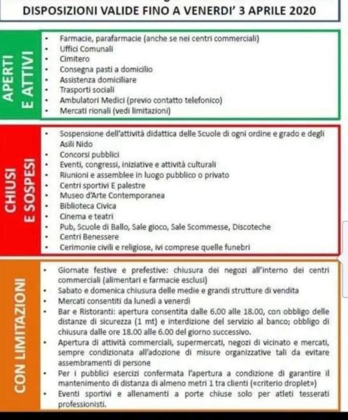 Le disposizioni, valide fino al 3 aprile, prevedono una limitazione delle attività di esercizi commerciali, bar e ristoranti, eventi sportivi, supermercati e centri commerciali, evitando in tal modo situazioni di affollamento. Del tutto sospese, invece, le attività didattiche, i concorsi pubblici, gli eventi, le cerimonie civili e religiose, comprese quelle funebri. Chiudono cinema e teatri, palestre, discoteche, sale scommesse e tutti i luoghi che prevedono assembramenti di persone.