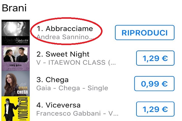 “Ebbene si … – ha scritto Andrea Sannino – Dopo 5 lunghi anni, e solo grazie alla vostra forza, Abbracciame è 1° in Classifica tra i brani più scaricati d’Italia! !! Chiederò alla mia etichetta Zeus Record di devolvere quello che sarà l’incasso, alla ricerca o ad uno degli ospedali impegnati nella lotta !!! GRAZIE ❤️….sono fiero di voi , tutto questo è un piccolo miracolo!!!”.