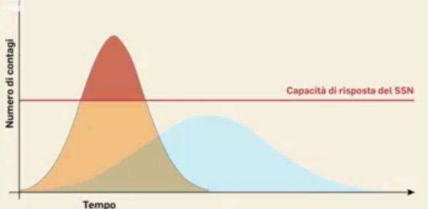“La linea orizzontale rappresenta la capacità degli ospedali di ricoverare i pazienti, fin qui reggono. Oltre no. In rosso quindi è rappresentata tutta gente che non potrà essere curata. Se invece il contagio è più lento la curva (in azzurro) è meno acuta e si protrae nel tempo, permette agli ospedali di curare più malati. La nostra curva attuale, che è appena partita, dove va a finire? Quanto durerà? Non lo sappiamo.