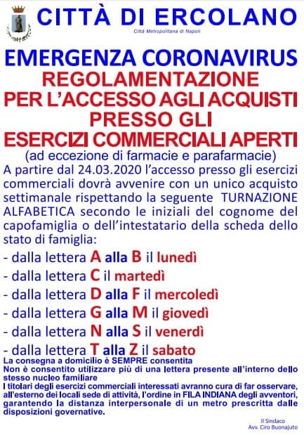 In piena emergenza Coronavirus, aumentano i provvedimenti per la sicurezza dei cittadini di Ercolano: da domani la spesa si farà in ordine alfabetico.