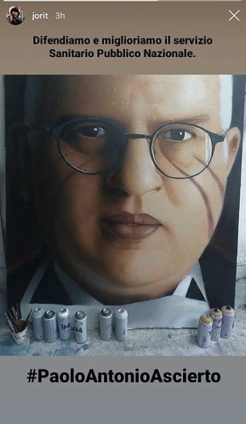 Lo street artist napoletano ha pubblicato l’immagine di Ascierto nelle sue Stories di Instagram e Facebook, aggiungendo alcune parole nella descrizione della foto: “Difendiamo e miglioriamo il Servizio sanitario pubblico nazionale”.