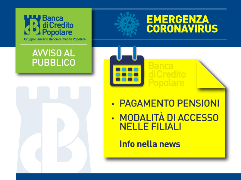 Nel rispetto dei provvedimenti governativi ed in sintonia con quanto stabilito dall’Associazione Bancaria Italiana, la BCP invita i propri Clienti all’utilizzo dei servizi digitali per limitare quanto più possibile ogni forma di contagio, e a recarsi in Filiale, solo se strettamente necessario, previo appuntamento.