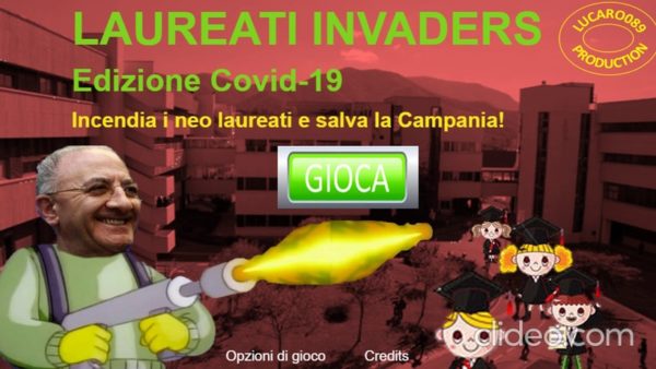 Intento ad incenerire con il suo lanciafiamme neo-laureati dell’Università Federico II, Vincenzo De Luca veste i panni dello sceriffo della Campania. Infatti, il titolo del gioco è “Laureati Invaders”, ispirato al ben più famoso “Space Invaders”. Lo slogan del videogame, virale ormai, è “Incendia i neolaureati e salva la Campania”. Per vincere e aumentare lo score, il governatore deve colpire più studenti possibile. L’ultimo stadio, la vittoria finale, vede De Luca, in tenuta da marine americano, recitare: “La Campania è salva, mi piace l’odore del Napalm alle feste di laurea”. In caso di sconfitta, parte un audio delle dirette dell’ex sindaco di Salerno, che dice: “C’è un buco nero tra le vostre orecchie con una tale forza di gravità che rende impossibile l’uscita non solo della luce e delle radiazioni ma anche del pensiero. Sta arrivando il collasso” . E anche la scritta “La Campania è infetta”.