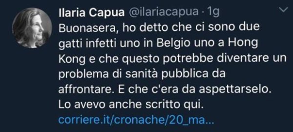 In sintesi, gli animali domestici non trasmettono il COVID-19 agli uomini, come già riferito dall’Istituto Zooprofilattico di Portici. Noi umani possiamo contagiarli, non viceversa. La virologa Ilaria Capua fa, infatti, sapere, tramite Twitter: “praticamente tutte le specie animali suscettibili a coronavirus respiratori. Sono colpite da forme lievi, spesso delle vie aeree superiori”. Altresì, nei due cani e nel gatto, analizzati ad Hong Kong, l’infezione si è evoluta in forma asintomatica. Il gatto, osservato, invece, in Belgio, ha mostrato mostrato anoressia, vomito, diarrea, difficoltà respiratorie e tosse. Ma, l’animale andato incontro a un miglioramento spontaneo a partire dal nono giorno dall’esordio della malattia.