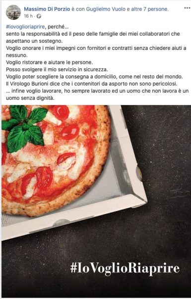 “#iovoglioriaprire perché… sento la responsabilità ed il peso delle famiglie dei miei collaboratori che aspettano un sostegno. Voglio onorare i miei impegni con fornitori e contratti senza chiedere aiuti a nessuno. Voglio ristorare e aiutare le persone. Posso svolgere il mio servizio in sicurezza.Voglio poter scegliere la consegna a domicilio, come nel resto del mondo. Il Virologo Burioni dice che i contenitori da asporto non sono pericolosi.