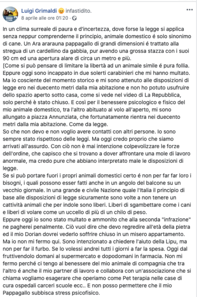 Lo stesso Grimaldi si sfogò sulla sua bacheca Facebook dichiarando che il pappagallo, al pari di qualsiasi altro animale ha bisogno di prendere aria per il suo sviluppo psico-fisico.