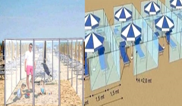 Ma con una buona dose di precauzioni, distanza tra gli ombrelloni e pareti in plexiglass tra gli ombrelloni. L’idea arriva da un’azienda del Modenese. Cubi di alluminio e plexiglass delle dimensioni di 4,5 metri per lato, con un’altezza di due metri e una porta per entrare.