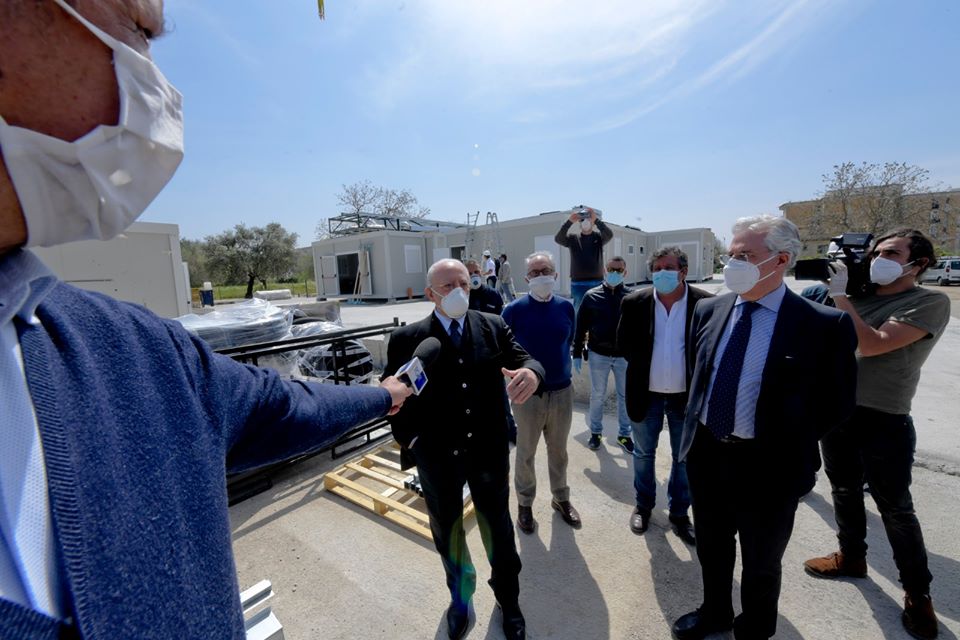 I lavori all’Ospedale Covid-19 di Caserta proseguono a ritmo serrato. Oggi il Presidente Vincenzo De Luca ha effettuato un sopralluogo al cantiere dell’ospedale modulare dove ieri sono giunte le strutture prefabbricate.