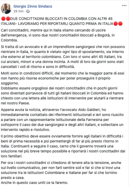 Coronavirus. Cittadini di San Giorgio bloccati in Colombia. Parla il sindaco Zinno