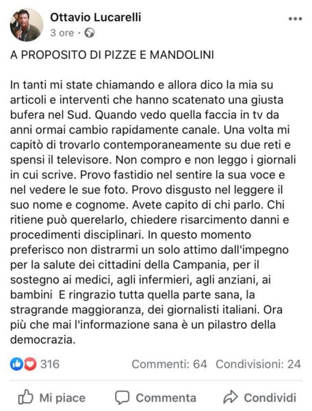 “A PROPOSITO DI PIZZE E MANDOLINI. In tanti mi state chiamando e allora dico la mia su articoli e interventi che hanno scatenato una giusta bufera nel Sud. Quando vedo quella faccia in tv da anni ormai cambio rapidamente canale. Una volta mi capitò di trovarlo contemporaneamente su due reti e spensi il televisore. Non compro e non leggo i giornali in cui scrive. Provo fastidio nel sentire la sua voce e nel vedere le sue foto. Provo disgusto nel leggere il suo nome e cognome. Avete capito di chi parlo. Chi ritiene può querelarlo, chiedere risarcimento danni e procedimenti disciplinari. In questo momento preferisco non distrarmi un solo attimo dall’impegno per la salute dei cittadini della Campania, per il sostegno ai medici, agli infermieri, agli anziani, ai bambini. E ringrazio tutta quella parte sana, la stragrande maggioranza, dei giornalisti italiani. Ora più che mai l’informazione sana è un pilastro della democrazia”.