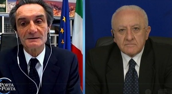 Ieri il governatore della Campania De Luca è stato ospite a Porta a Porta su Rai 1 dove ha avuto un faccia a faccia con Attilio Fontana, governatore della Lombardia. Queste le dichiarazioni salienti del presidente.