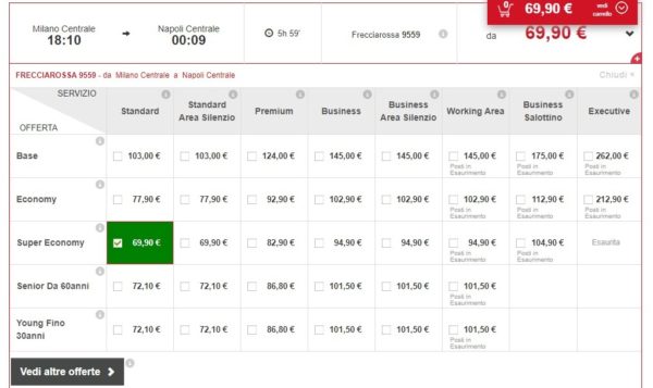 Frecciarossa da Milano a Napoli del 4 maggio, partenza ore 18:10. I posti esauriti o in esaurimento sono quelli più costosi, già in numero molto limitato