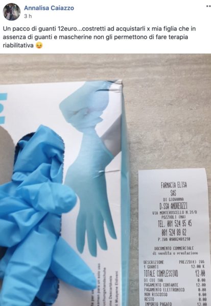 Questi due prodotti sono introvabili nella città di Napoli, da Posillipo al Vomero. I pochi fortunati che li trovano si sono ritrovati a pagare il doppio rispetto a un mese fa. Infatti se prima il prezzo di una confezione di guanti monouso da 100 lo si pagava dai 5 ai 6 euro, ora invece si è costretti a pagarlo 12 euro. E sono in tanti sui social a denunciare l’accaduto. Come Achille e Annalisa che postano la loro testimonianza da due città diverse campane.