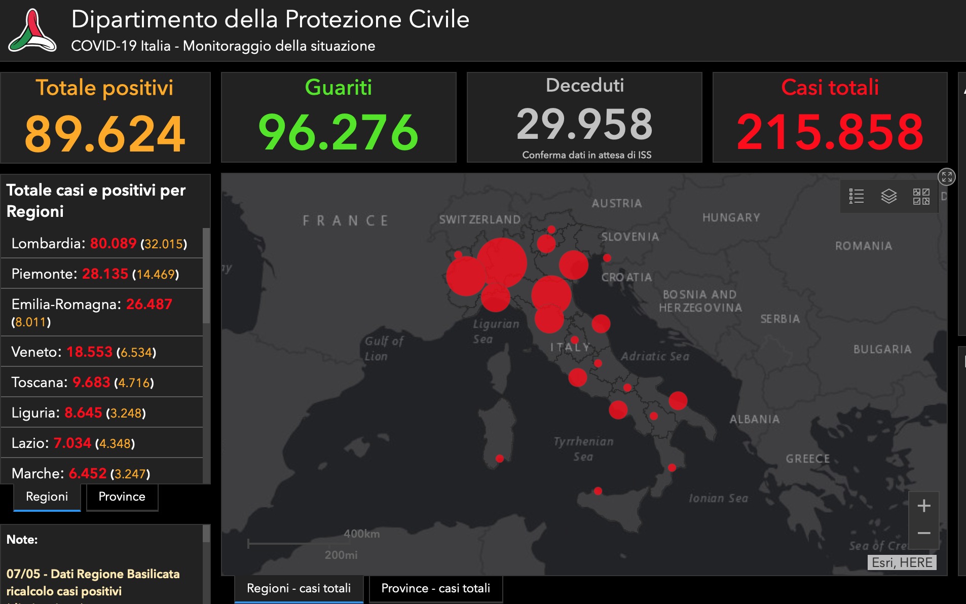 “Nell’ambito del monitoraggio sanitario relativo alla diffusione del Coronavirus sul nostro territorio, a oggi, 7 maggio, il totale delle persone che hanno contratto il virus è 215.858, con un incremento rispetto a ieri di 1.401 nuovi casi. Il numero totale di attualmente positivi è di 89.624, con una decrescita di 1.904 assistiti rispetto a ieri. Tra gli attualmente positivi 1.311 sono in cura presso le terapie intensive, con una decrescita di 22 pazienti rispetto a ieri.