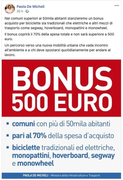L’idea parte dalla ministra delle infrastrutture e dei trasporti Paola De Micheli. Il bonus, del valore di 500 euro prevede l’acquisto di un mezzo con lo sconto applicato di circa il 65-70%. Rivolto a tutti quelli che ne faranno domanda, senza esclusioni di particolari categorie. “E’ allo studio e in dirittura d’arrivo il riconoscimento di un buono di mobilità alternativa, per i residenti nelle città metropolitane e aree urbane con più di 50.000 abitanti, fino ad un massimo di 500 euro per l’acquisto di biciclette, anche a pedalata assistita, nonché di veicoli per la mobilità personale a propulsione prevalentemente elettrica, e monopattini“. Queste le parole della ministra.