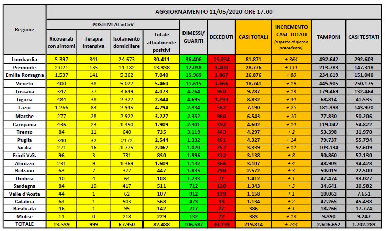 In particolare, nell’ambito del monitoraggio sanitario relativo alla diffusione del Coronavirus sul nostro territorio, a oggi, 11 maggio, il totale delle persone che hanno contratto il virus è 219.814, con un incremento rispetto a ieri di 744 nuovi casi. Il numero totale di attualmente positivi è di 82.488, con una decrescita di 836 assistiti rispetto a ieri.