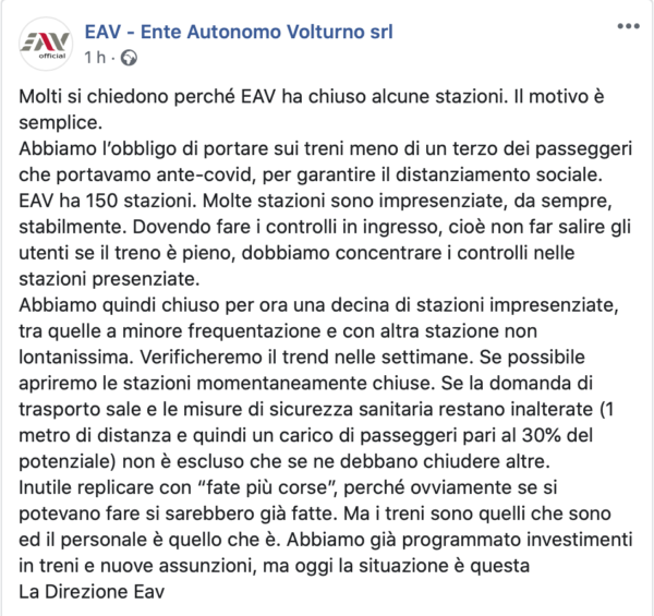 “Molti si chiedono perché EAV ha chiuso alcune stazioni. Il motivo è semplice. Abbiamo l’obbligo di portare sui treni meno di un terzo dei passeggeri che portavamo ante-covid, per garantire il distanziamento sociale. EAV ha 150 stazioni. Molte stazioni sono impresenziate, da sempre, stabilmente.