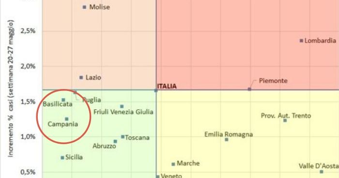 Le regioni che, insieme alla Campania, si trovano nel quadrante verde sono: Basilicata, Puglia, Friuli Venezia Giulia, Toscana, Abruzzo, Sicilia, Calabria, Sardegna e Puglia. Tutte le regioni dell’estremo Sud Italia, come si può notare, sono da considerare a basso rischio di contagio.