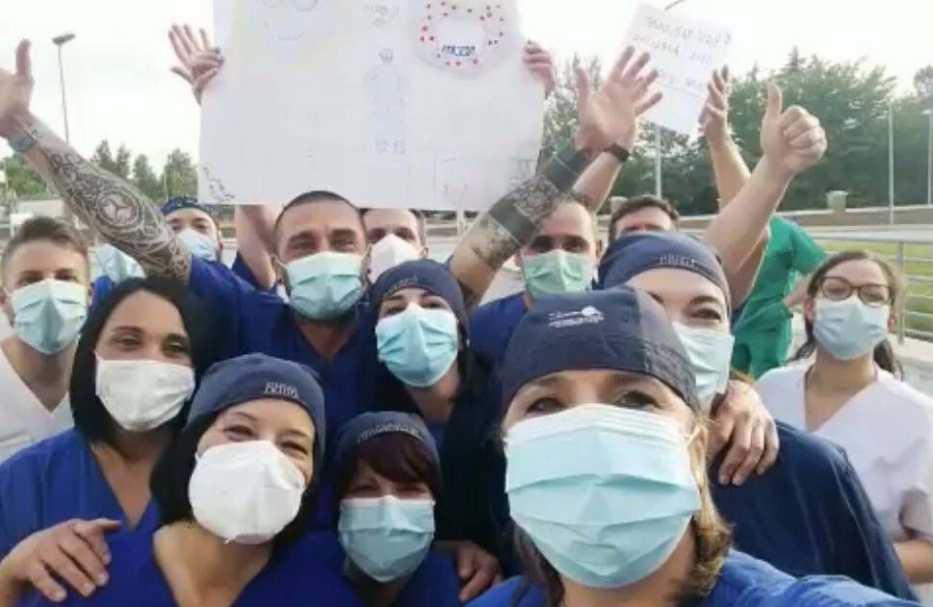 Bottiglie di spumante aperte, qualche abbraccio di troppo e le immancabili mascherine. La gioia è tangibile e ben visibile nei due minuti di filmato. Numerosi i cartelli esposti dai medici e dagli infermieri con le scritte: