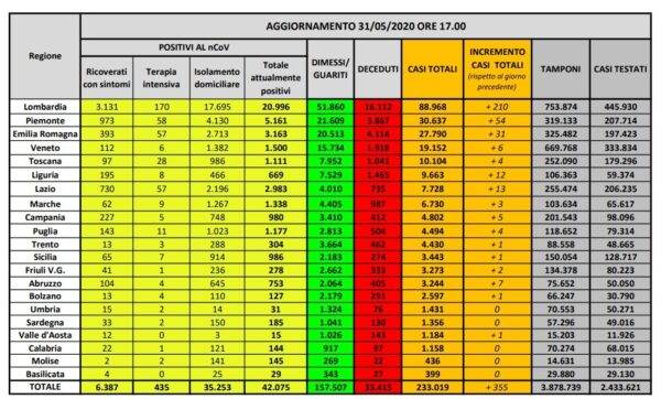 Continua l’impegno del Dipartimento nelle attività di coordinamento di tutte le componenti e strutture operative del Servizio Nazionale della protezione civile. In particolare, nell’ambito del monitoraggio sanitario relativo alla diffusione del Coronavirus sul nostro territorio, a oggi, 31 maggio, il totale delle persone che hanno contratto il virus è di 233.019, con un incremento rispetto a ieri di 355 nuovi casi.