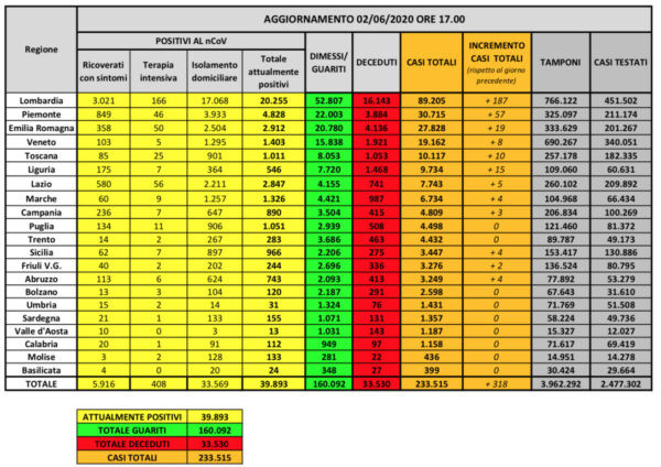 Come di consueto, la Protezione Civile ha diramato il bollettino del 2 giugno sul proprio sito per aggiornate sulla situazione in Italia per l’emergenza Coronavirus. Quello di ieri è stato il dato più basso dal 26 febbraio: solo 178 nuovi casi e 60 deceduti. Oggi invece si sono registrati 318 casi, quasi il doppio. La metà è concentrata in Lombardia con 187 casi, 57 in Piemonte. Nove le regioni con contagi zero.