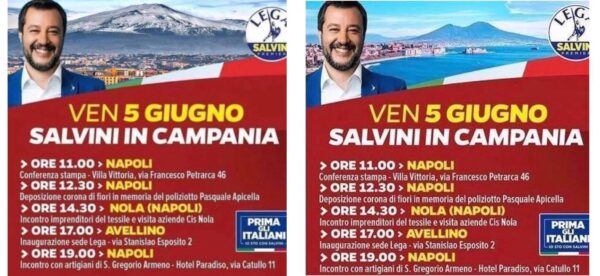 Fissata per oggi venerdì 5 giugno la visita di Matteo Salvini in Campania, tra Napoli, Nola e Avellino. Ecco spuntare però un errore nella foto scelta per l’evento. Al posto del nostro amatissimo Vesuvio compare come sottofondo una foto dell’Etna.
