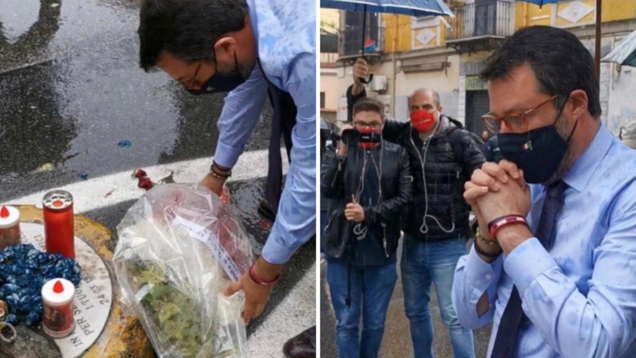 Matteo Salvini oggi è in Campania. Nel suo programma giornaliero ha fatto visita al luogo dove ha perso la vita Pasquale Apicella, il poliziotto morto in servizio a Calata Capodichino in un incidente contro l’auto dei ladri. Mani incrociate in preghiera e una corona di fiori sono stati lasciati dall’ex ministro degli interni che ha postato le foto sui suoi profili social. Una toccata e fuga data la pioggia battente. Ma alcune persone hanno voluto manifestare la loro contrarietà a questo gesto, ritenuto uno strumentalizzazione politica.