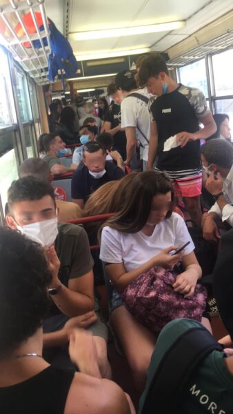 Infatti dalle 9.30 alle 11.30 i treni in direzione Sorrento effettueranno regolare servizio viaggiatori esclusivamente tra Torre Annunziata e Sorrento. I giovani hanno allora preso il treno in partenza da Napoli delle 10.27 e diretto a Poggiomarino. Poi sono scesi alla fermata di Torre Annunziata. Le foto scattate dalla nostra collega Marina D’Alessio mostrano l’assembramento presente sui vagoni dove mantenere la distanza di un metro è impossibile. Tutti i posti a sedere sono occupati e molte persone sono all’inpiedi.