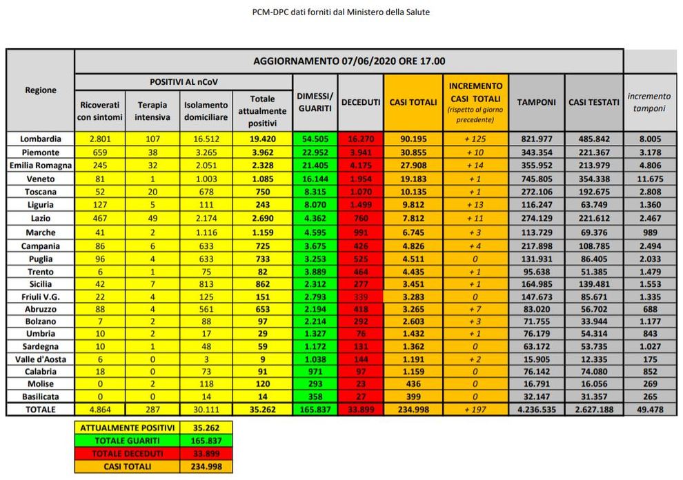 In particolare, nell’ambito del monitoraggio sanitario relativo alla diffusione del Coronavirus sul nostro territorio, a oggi, 7 giugno, il totale delle persone che hanno contratto il virus è di 234.998, con un incremento rispetto a ieri di 197 nuovi casi.