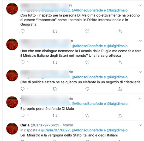 Si fa chiamare su Twitter Carla, ma molto probabilmente è un profilo falso, e negli ultimi due giorni sta riempiendo di insulti i politici italiani sia di destra che di sinistra. A volte però sta andando oltre nei suoi tweet minacciando addirittura di morte il ministro degli esteri Luigi di Maio.