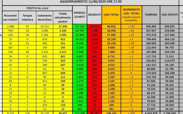 In particolare, nell’ambito del monitoraggio sanitario relativo alla diffusione del Coronavirus sul nostro territorio, a oggi, 11 giugno, il totale delle persone che hanno contratto il virus è di 236.142, con un incremento rispetto a ieri di 379 nuovi casi.