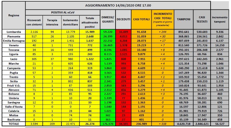 “Meno di 4.000 i pazienti ricoverati nelle strutture ospedaliere. In particolare, nell’ambito del monitoraggio sanitario relativo alla diffusione del Coronavirus sul nostro territorio, a oggi, 14 giugno, il totale delle persone che hanno contratto il virus è di 236.989, con un incremento rispetto a ieri di 338 nuovi casi. Il numero totale di attualmente positivi è di 26.274, con una decrescita di 1.211 assistiti rispetto a ieri. Tra gli attualmente positivi, 209 sono in cura presso le terapie intensive, con una decrescita di 11 pazienti rispetto a ieri. 3.594 persone sono ricoverate con sintomi, con un decremento di 153 pazienti rispetto a ieri. 22.471 persone, pari all’86% degli attualmente positivi, sono in isolamento senza sintomi o con sintomi lievi. Rispetto a ieri i deceduti sono 44 e portano il totale a 34.345. Il numero complessivo dei dimessi e guariti sale invece a 176.370, con un incremento di 1.505 persone rispetto a ieri”.
