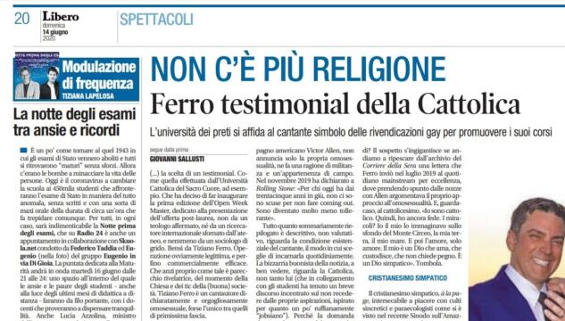 In prima pagina e all’interno del giornale, Libero commenta la scelta dell’università Cattolica di affidarsi “al cantante simbolo delle rivendicazioni gay”.