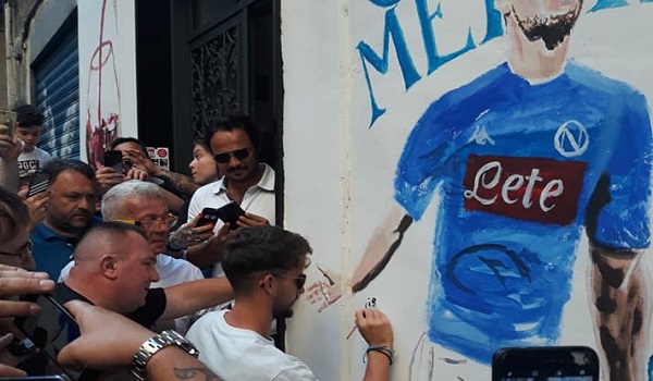 Mertens è stato invitato a firmare il murale che si trova ai Quartieri Spagnoli, proprio di fronte ad un altro: quello di Diego Armando Maradona, leggenda azzurra e idolo da sempre dei tifosi napoletani.